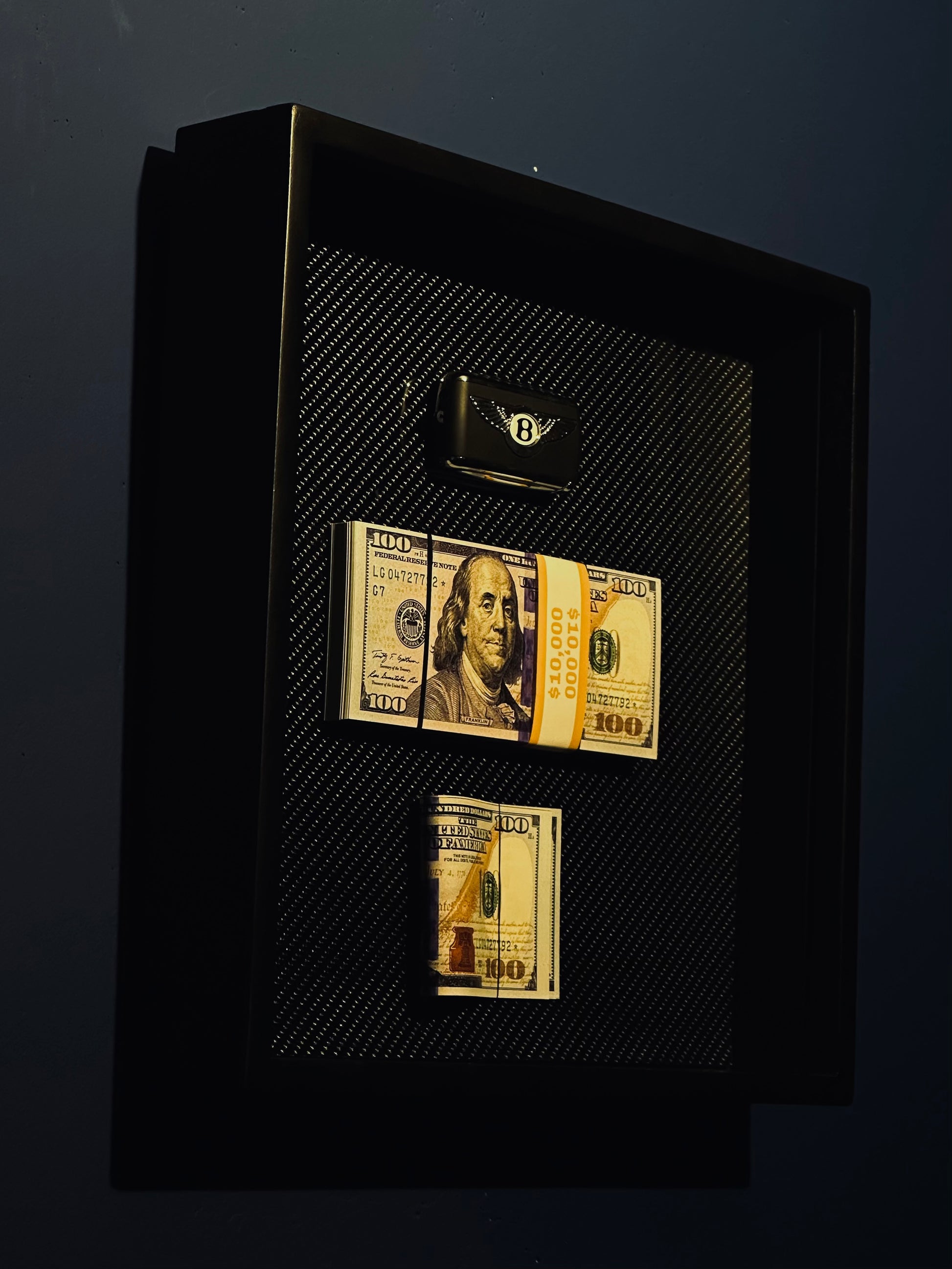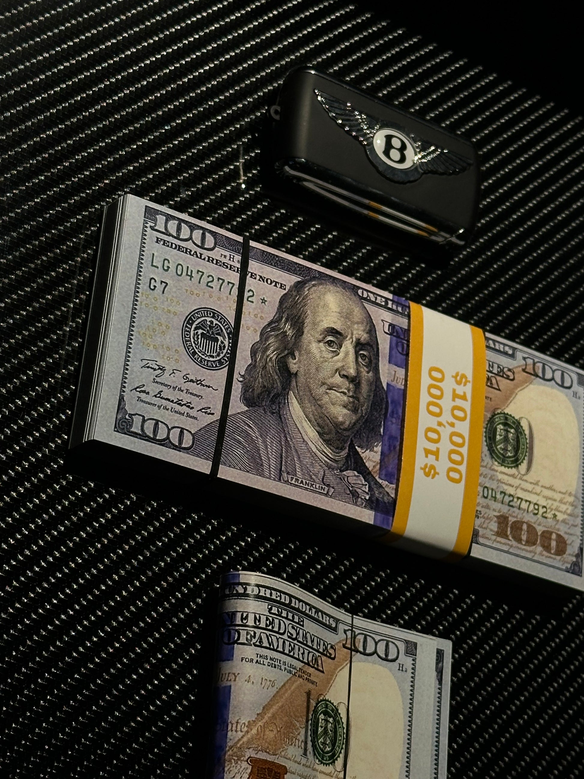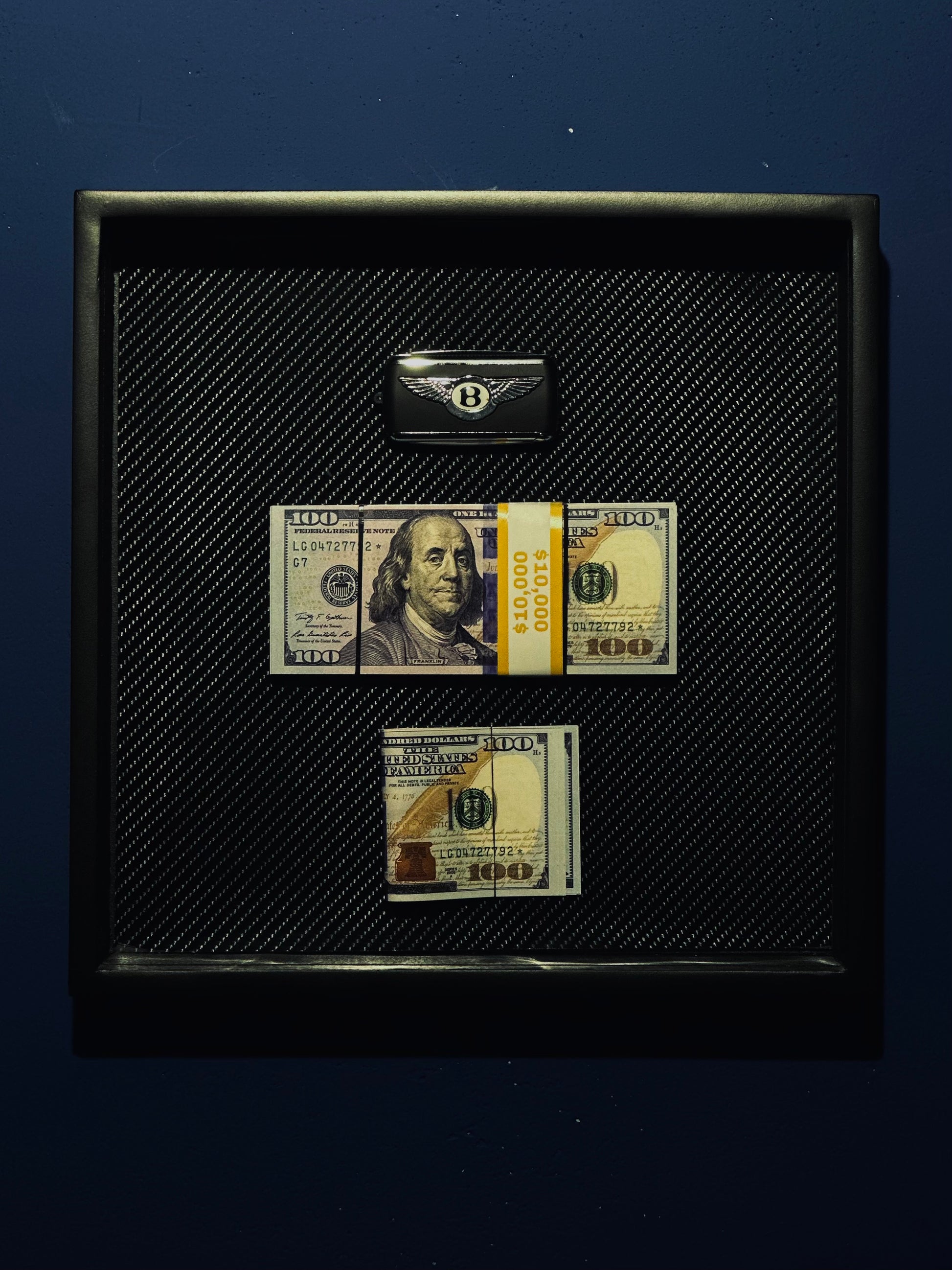 A sleek, minimalist piece featuring neatly aligned bills and a Bentley key pouch. Clean, classy, and full of power.