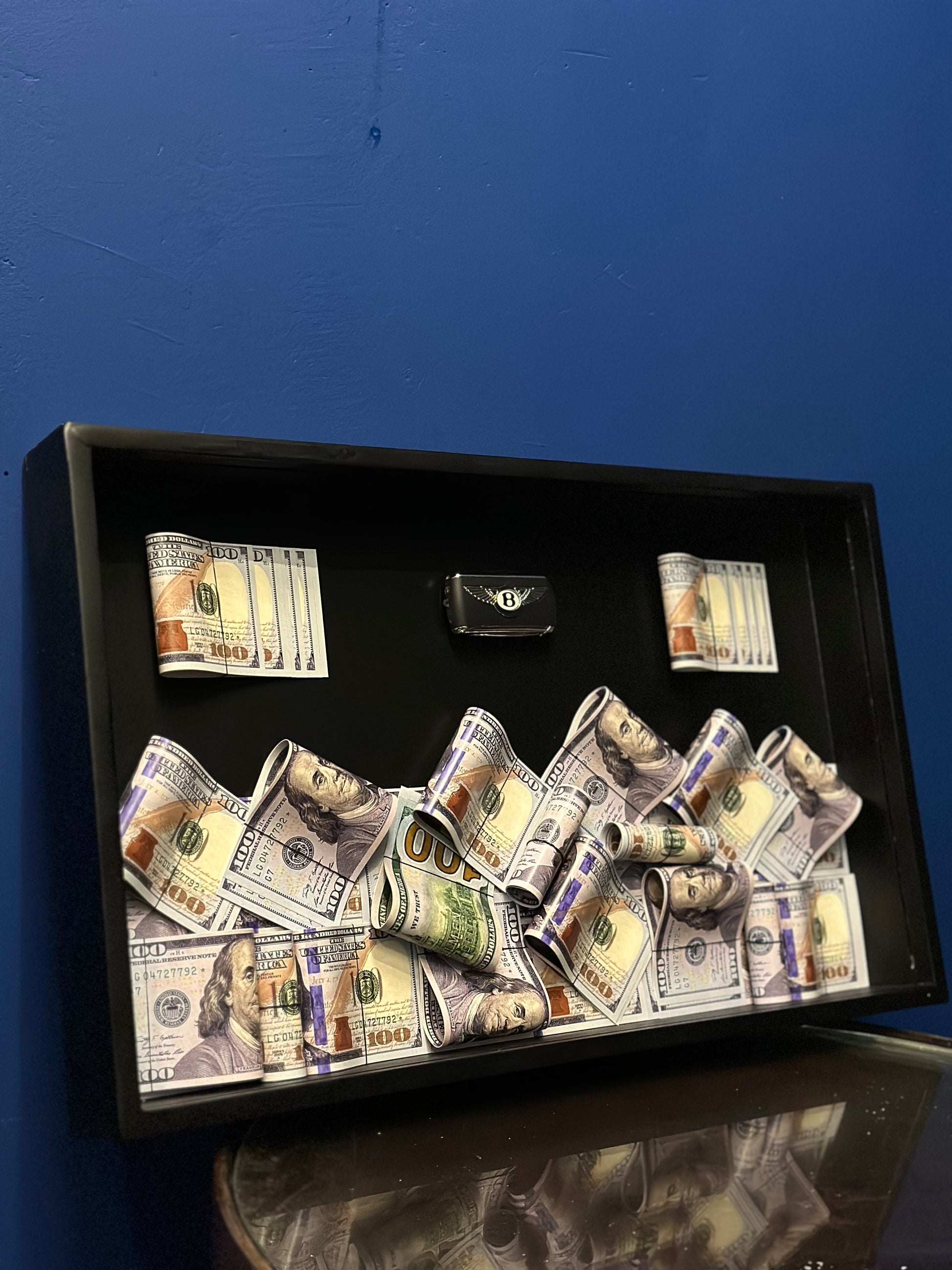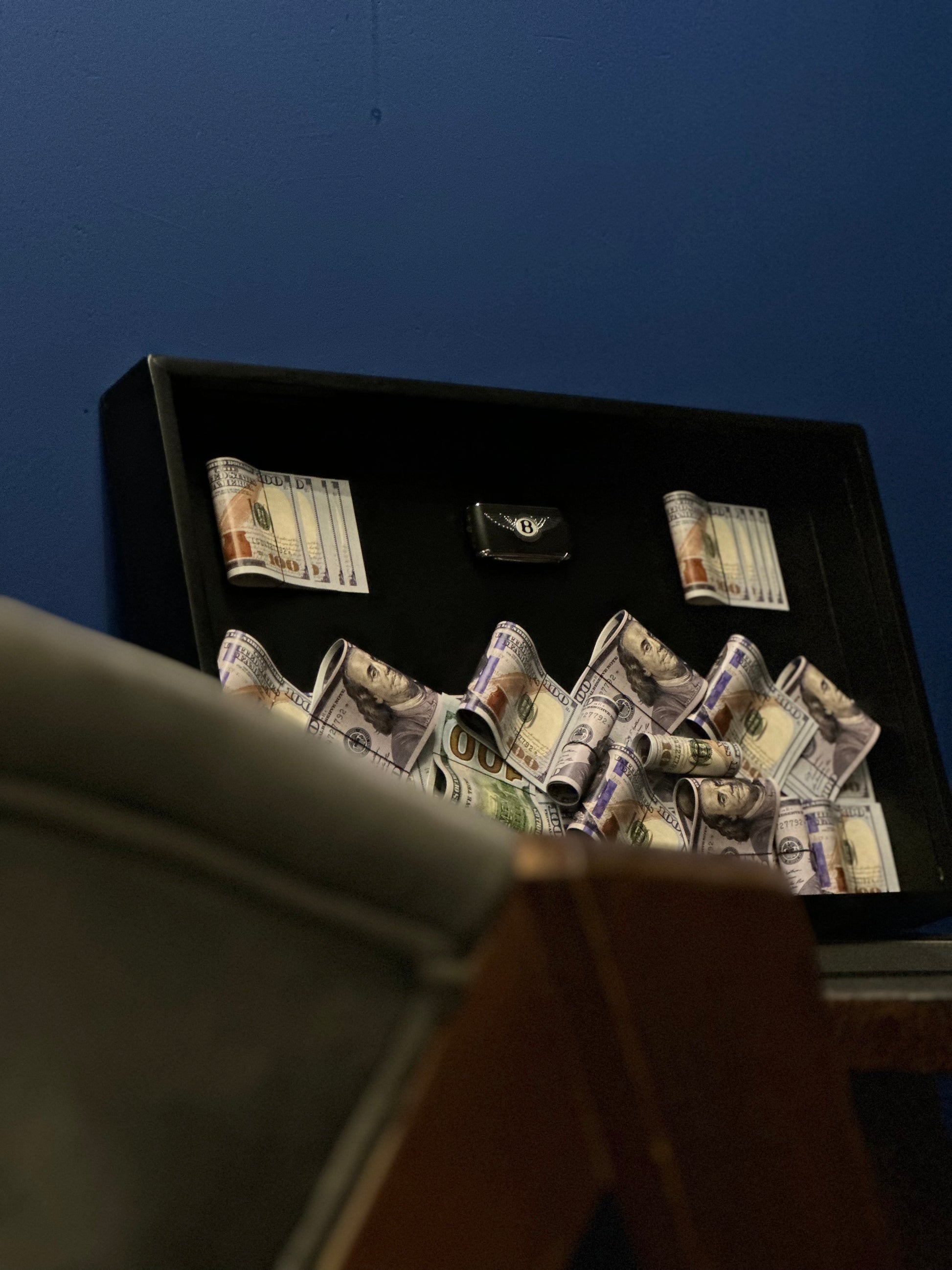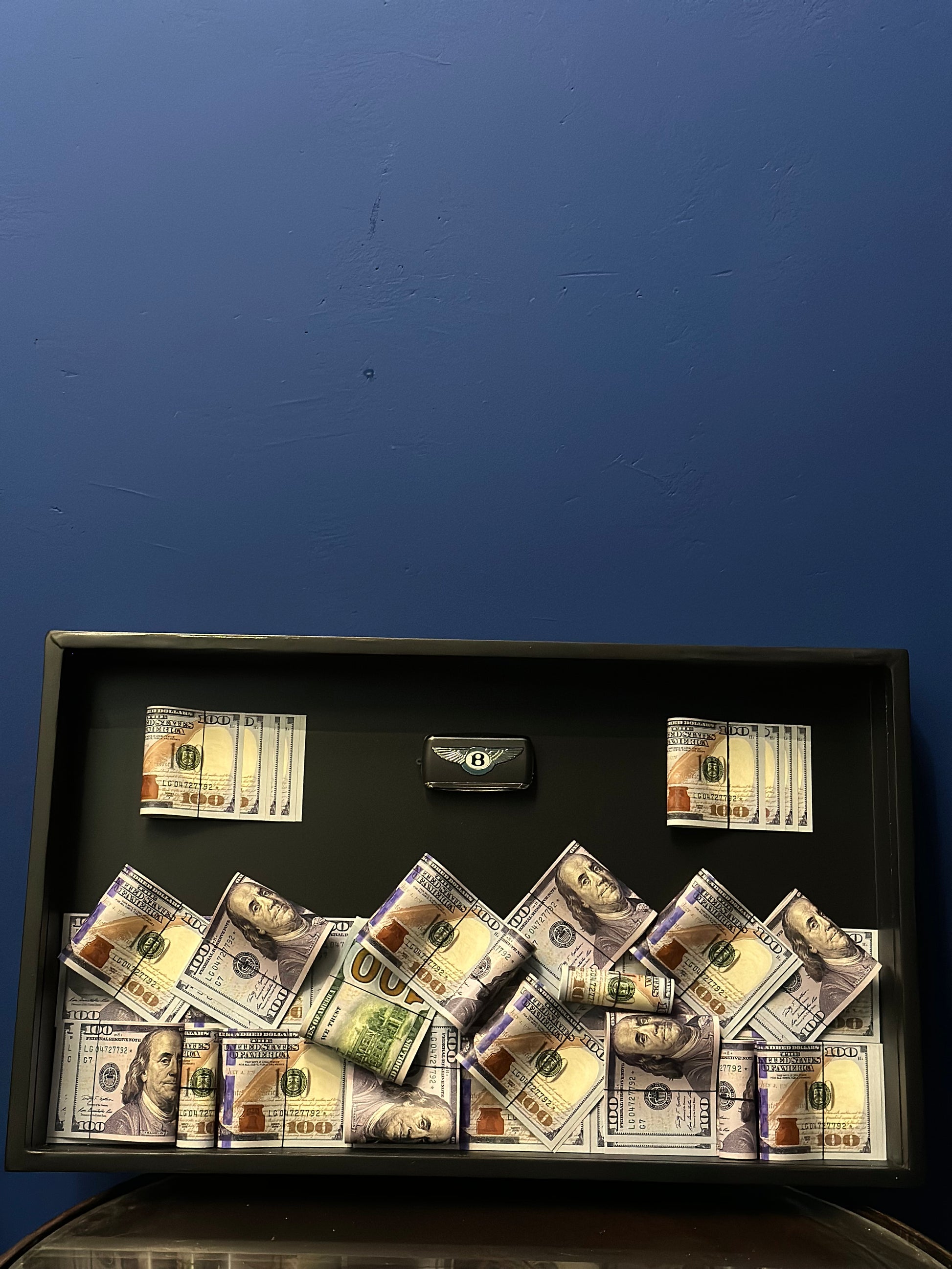 Layers of cash carefully arranged with a Bentley key in the center. Controlled chaos meets ultimate luxury.